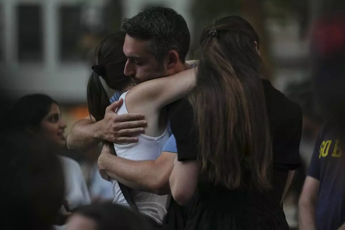 People hug while attending a vigil at Bryant Park for the people killed by a gunman at a Manhattan office building the day before, Tuesday, July 29, 2025, in New York. (AP Photo/Angelina Katsanis)