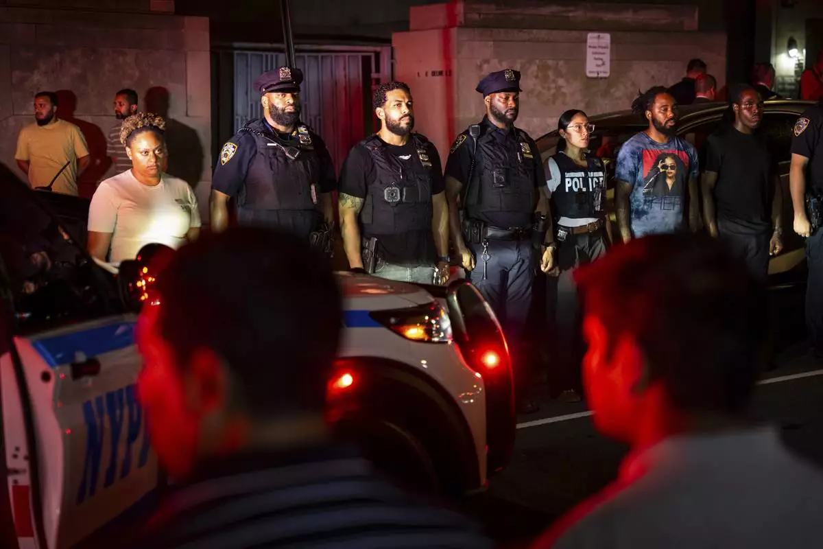 NYPD officers line up during the dignified transfer of Didarul Islam, who was shot and killed by a gunman earlier this evening, out of NewYork-Presbyterian/Weill Cornell Medical Hospital to the medical examiner's office, Tuesday, July 28, 2025, in New York. (AP Photo/Angelina Katsanis)