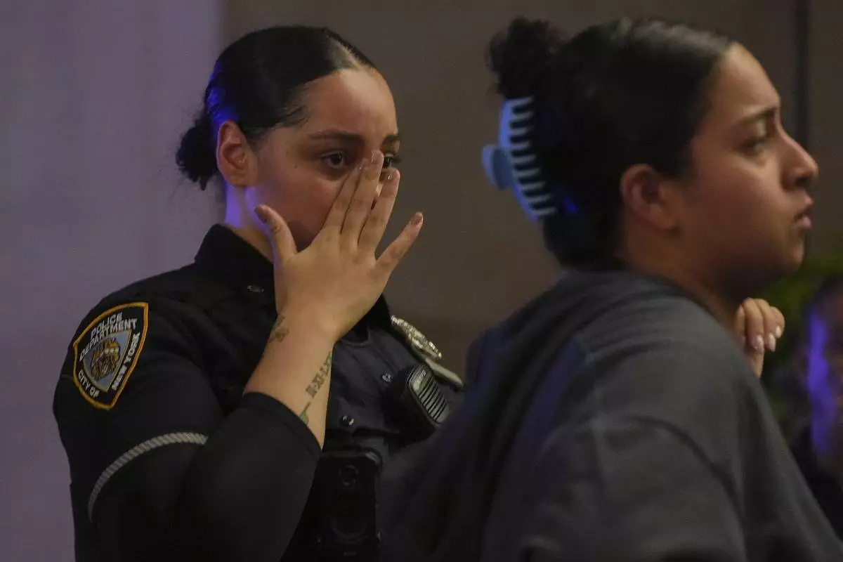 New York Police officers react as they gather outside New York Presbyterian Weil Cornell Medical Center where a police officer was brought after being shot at a Manhattan office building, Monday, July 28, 2025, in New York. (AP Photo/Angelina Katsanis)