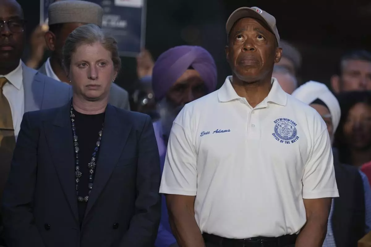 New York Police commissioner Jessica Tisch, left, and New York Mayor Eric Adams attend a vigil, Tuesday, July 29, 2025, in New York. (AP Photo/Angelina Katsanis)