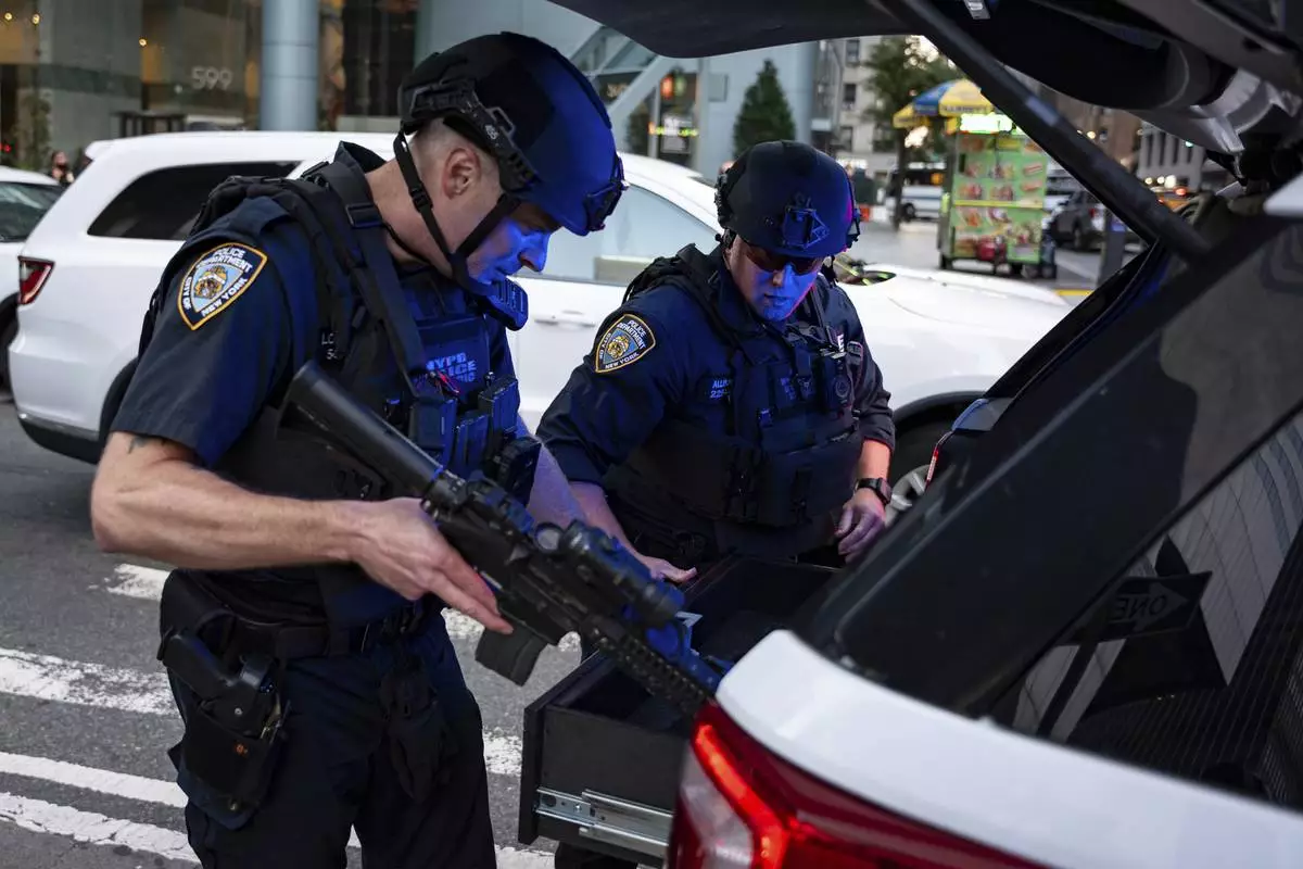 New York Police Department officers arrive on the corner of Lexington Avenue and 53rd Street, near a Manhattan office building after a shooting, Monday, July 28, 2025, in New York. (AP Photo/Angelina Katsanis)