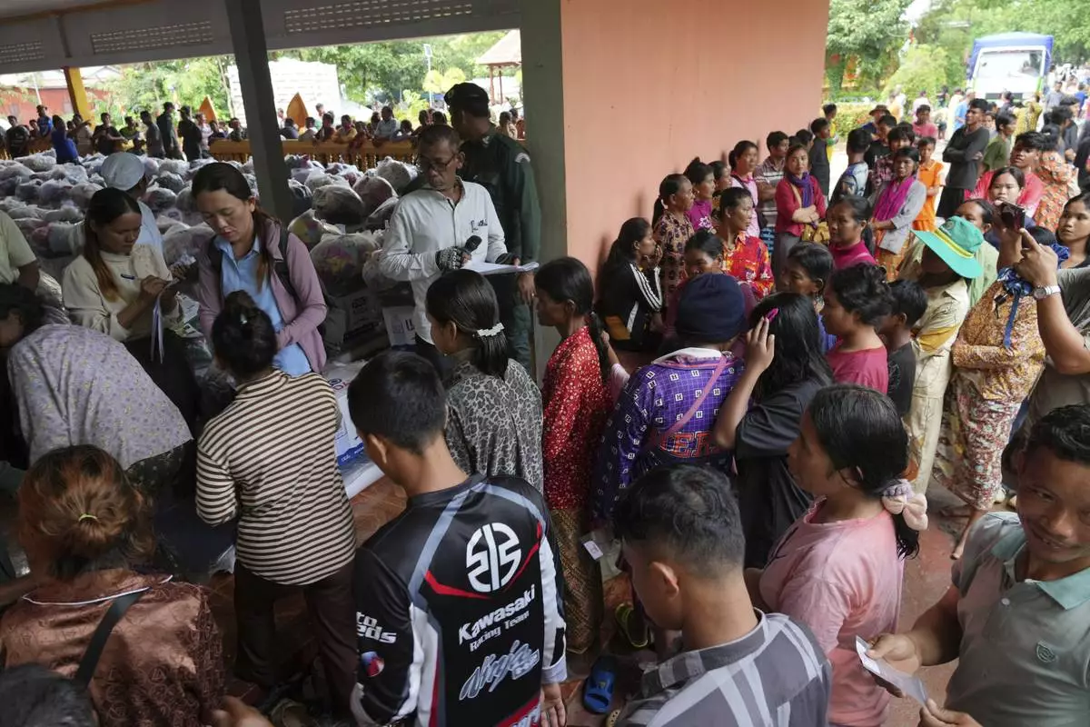 Local villagers wait to receive supplies donated by a charity, in Srey Snam district, Siem Reap province, Cambodia, Monday, July 28, 2025, amid the fighting between Thailand and Cambodia. (AP Photo/Heng Sinith)