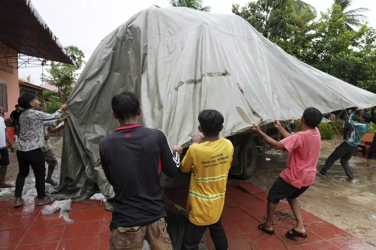 Local villagers help unloading supplies donated by a charity for refugees from a truck, in Srey Snam district, Siem Reap province, Cambodia, Monday, July 28, 2025, amid the fighting between Thailand and Cambodia. (AP Photo/Heng Sinith)