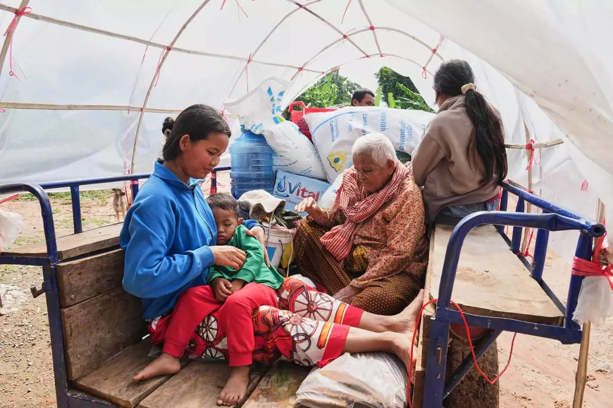 A Cambodian family sits on a tractor cart of as they return home from a temporary shelter in Prasat Roboeuk village, Oddar Meanchey province, Cambodia, Tuesday, July 29, 2025, after a ceasefire was supposed to take effect Monday night between Thailand and Cambodia. (AP Photo/Heng Sinith)