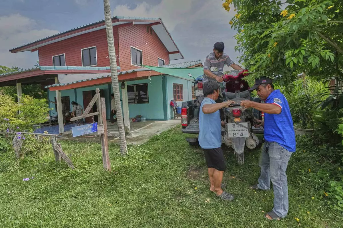 Kritsada Jindasri, top, Sommai Jindasri, left, and Jirayu Jindasri who fled their home following the clashes between Thai and Cambodian soldiers lift a motorcycle off a vehicle as they return home in Surin province, Thailand, Tuesday, July 29, 2025 after the ceasefire was supposed to take effect at midnight on July 28, 2025. (AP Photo/Sakchai Lalit)