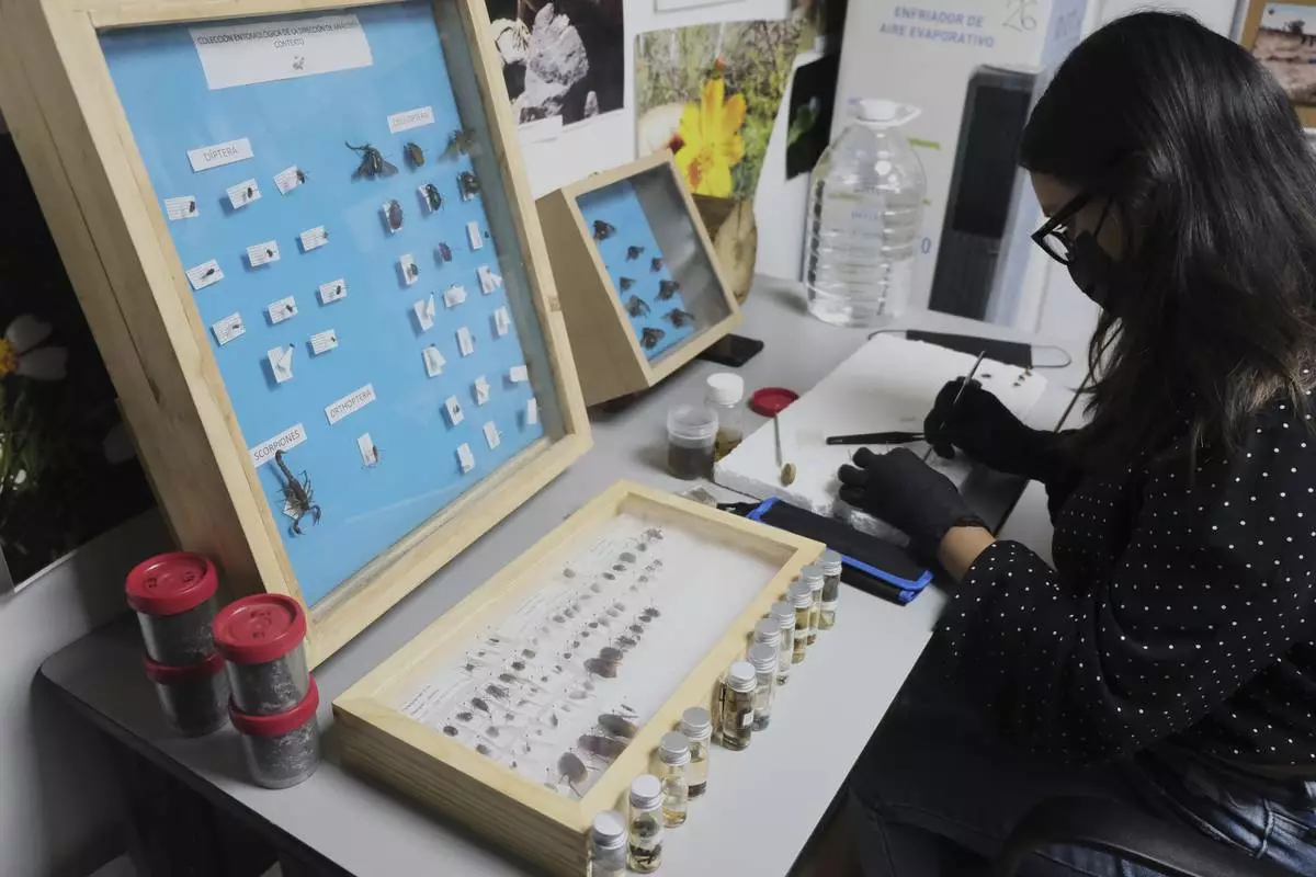 A specialist examines insects collected from clandestine graves in Jalisco, which are currently being studied as part of a research project to help find people who have gone missing in Mexico during decades of drug cartel violence, in Guadalajara, Mexico, Friday, July 11, 2025. (AP Photo/Alejandra Leyva)