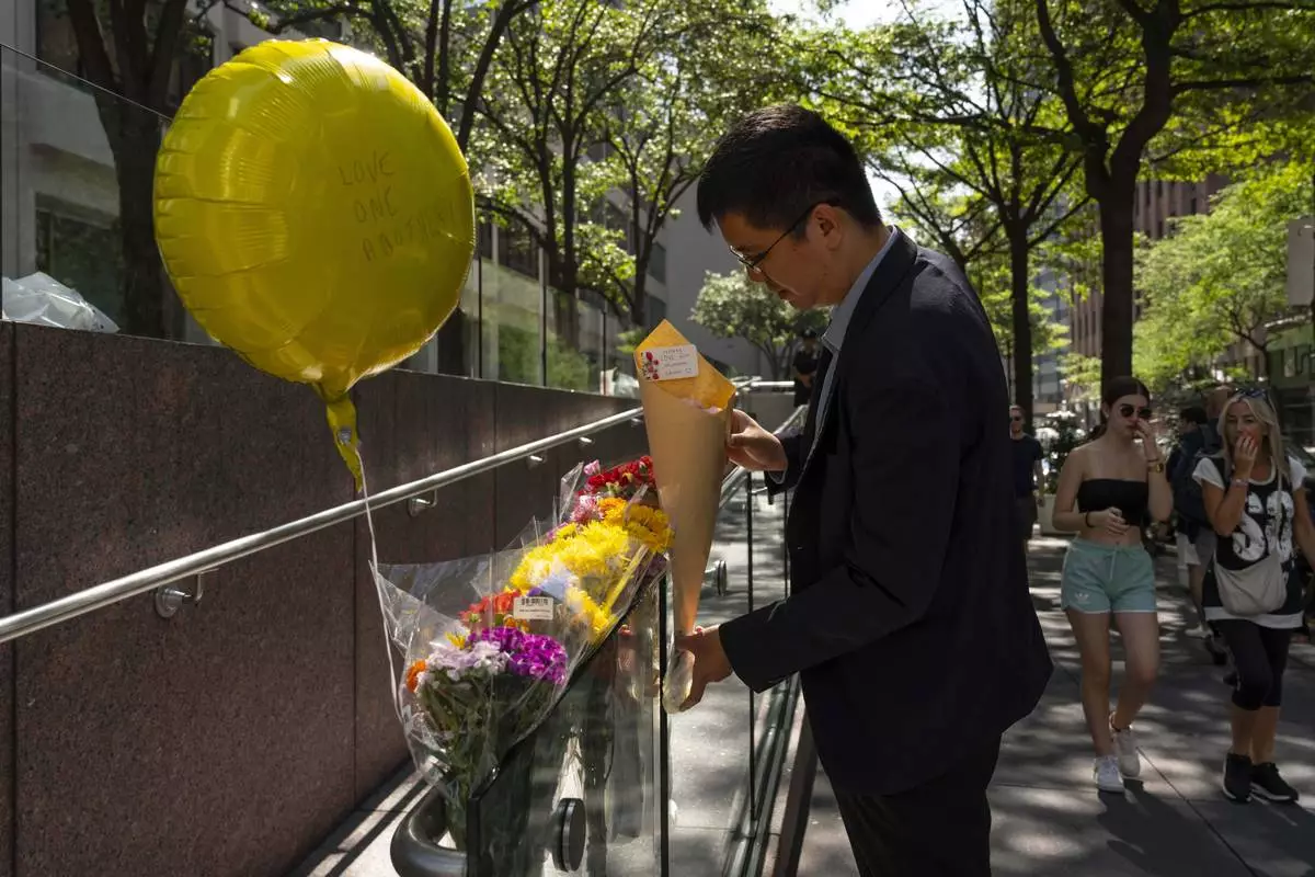 A person leaves flowers at a make shift memorial outside scene of Monday's deadly shooting, Tuesday, July 29, 2025, in New York. (AP Photo/Yuki Iwamura)