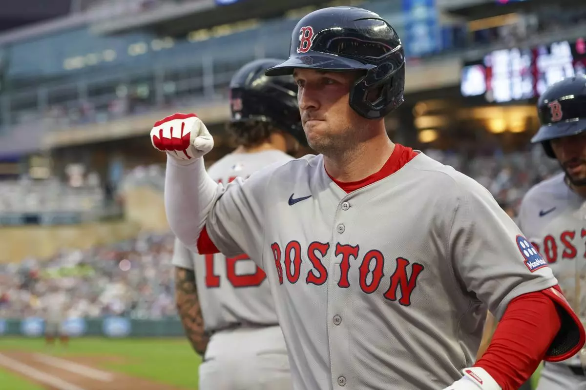 Boston Red Sox's Alex Bregman celebrates as he returns to the dugout after hitting a three-run home run against the Minnesota Twins during the fifth inning of a baseball game Monday, July 28, 2025, in Minneapolis. (AP Photo/Craig Lassig)