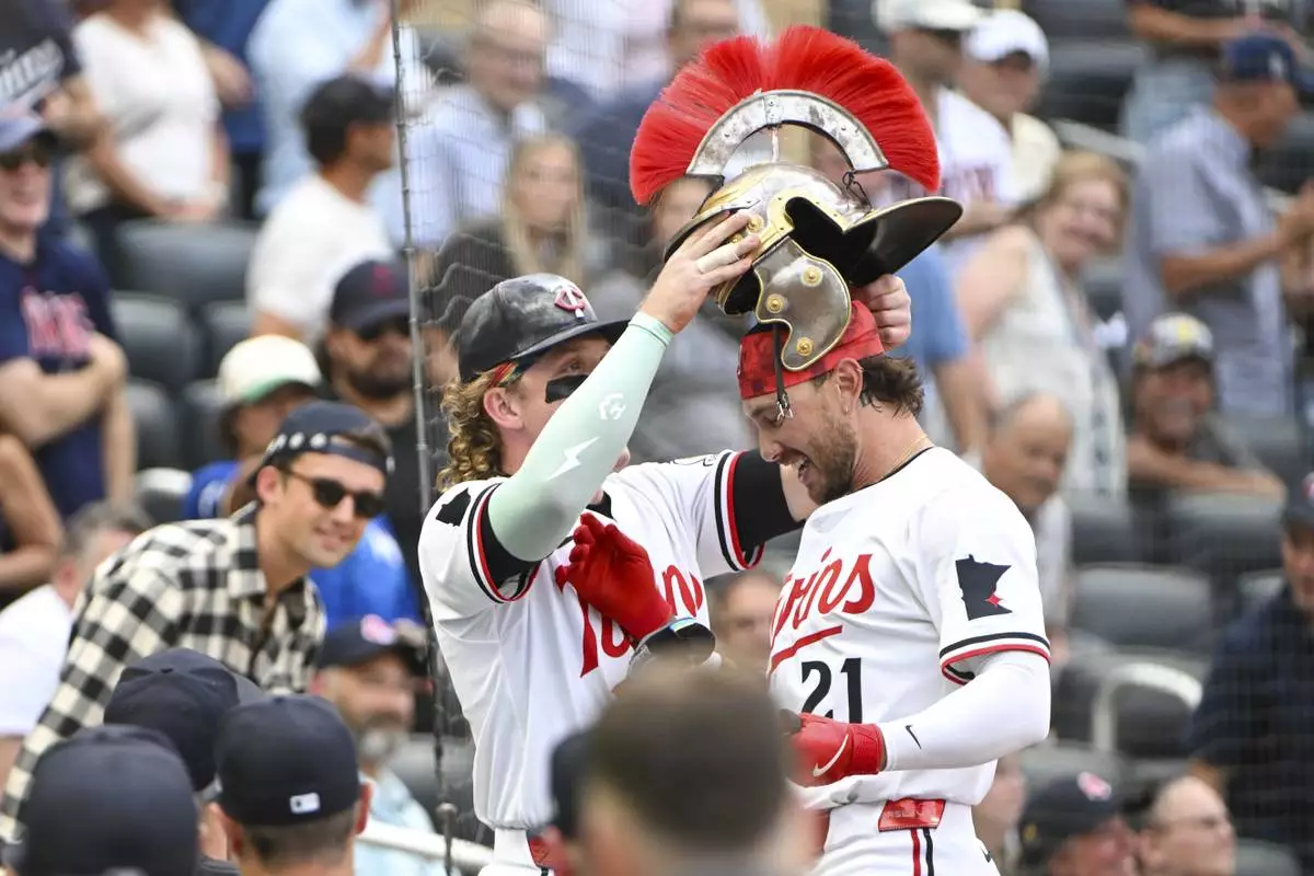 Minnesota Twins' DaShawn Keirsey, right, gets a home-run helmet placed on his head by Harrison Bader after hitting a two-run home run against the Boston Red Sox during the third inning of a baseball game Monday, July 28, 2025, in Minneapolis. Minnesota Twins' Christian Vazquez also scored. (AP Photo/Craig Lassig)