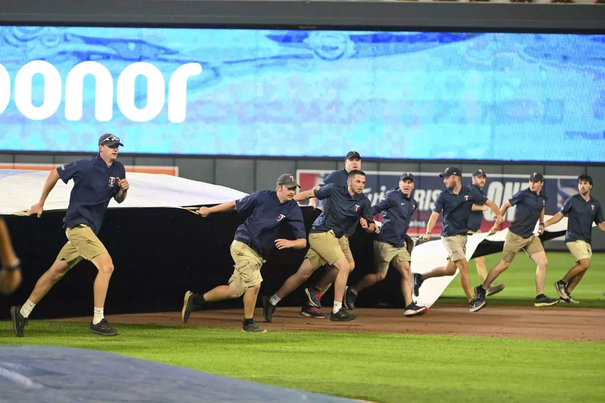Grounds crews scramble to roll out the tarp as a storm delays the game between the Minnesota Twins and the Boston Red Sox during the ninth inning of a baseball gam,e Monday, July 28, 2025, in Minneapolis. (AP Photo/Craig Lassig)