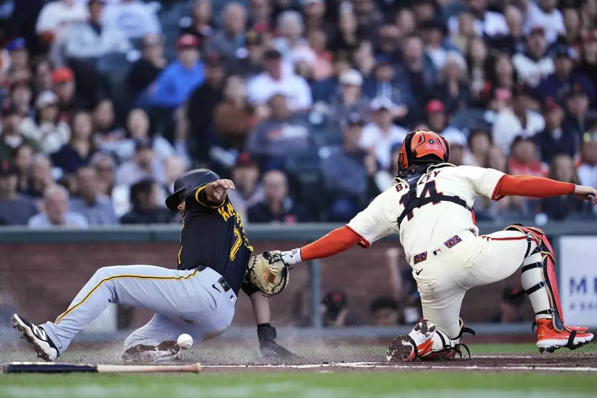 Pittsburgh Pirates' Isiah Kiner-Falefa, left, scores as San Francisco Giants catcher Patrick Bailey is unable to hang on to the ball on the throw from left fielder Heliot Ramos during the second inning of a baseball game Monday, July 28, 2025, in San Francisco. (AP Photo/Godofredo A. Vásquez)