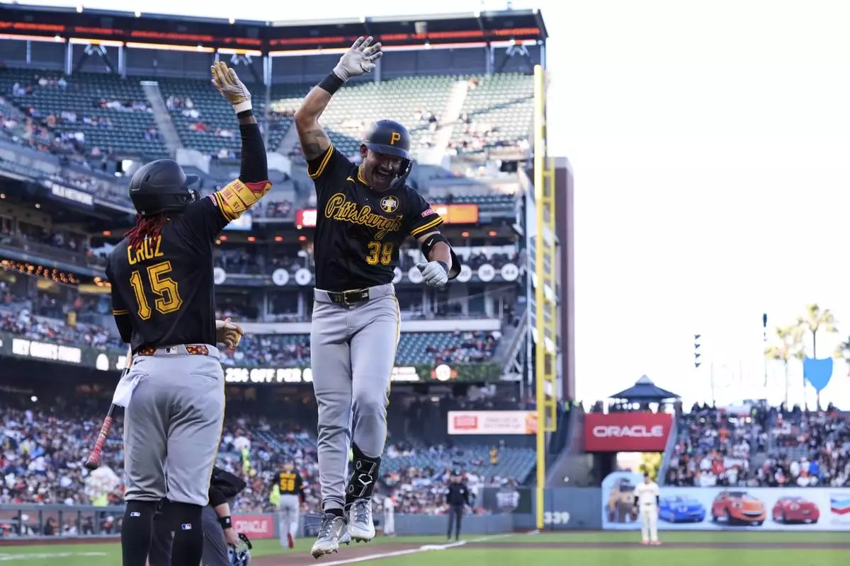 Pittsburgh Pirates' Nick Gonzales (39) celebrates with Oneil Cruz (15) after hitting a solo home run during the first inning of a baseball game against the San Francisco Giants, Monday, July 28, 2025, in San Francisco. (AP Photo/Godofredo A. Vásquez)
