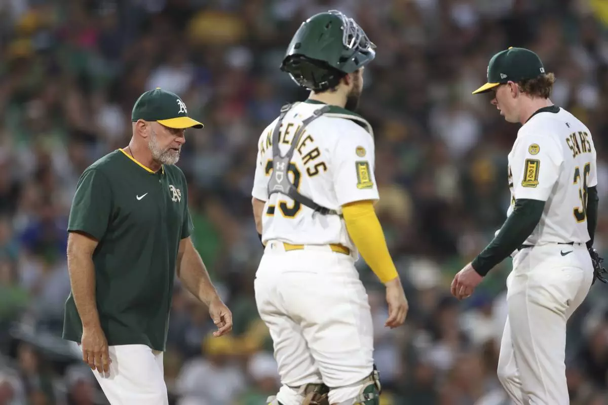 Athletics manager Mark Kotsay, left, pulls Athletics pitcher JP Sears, right during the fifth inning of a baseball game against the Seattle Mariners, Monday, July 28, 2025, in West Sacramento, Calif. (AP Photo/Scott Marshall)