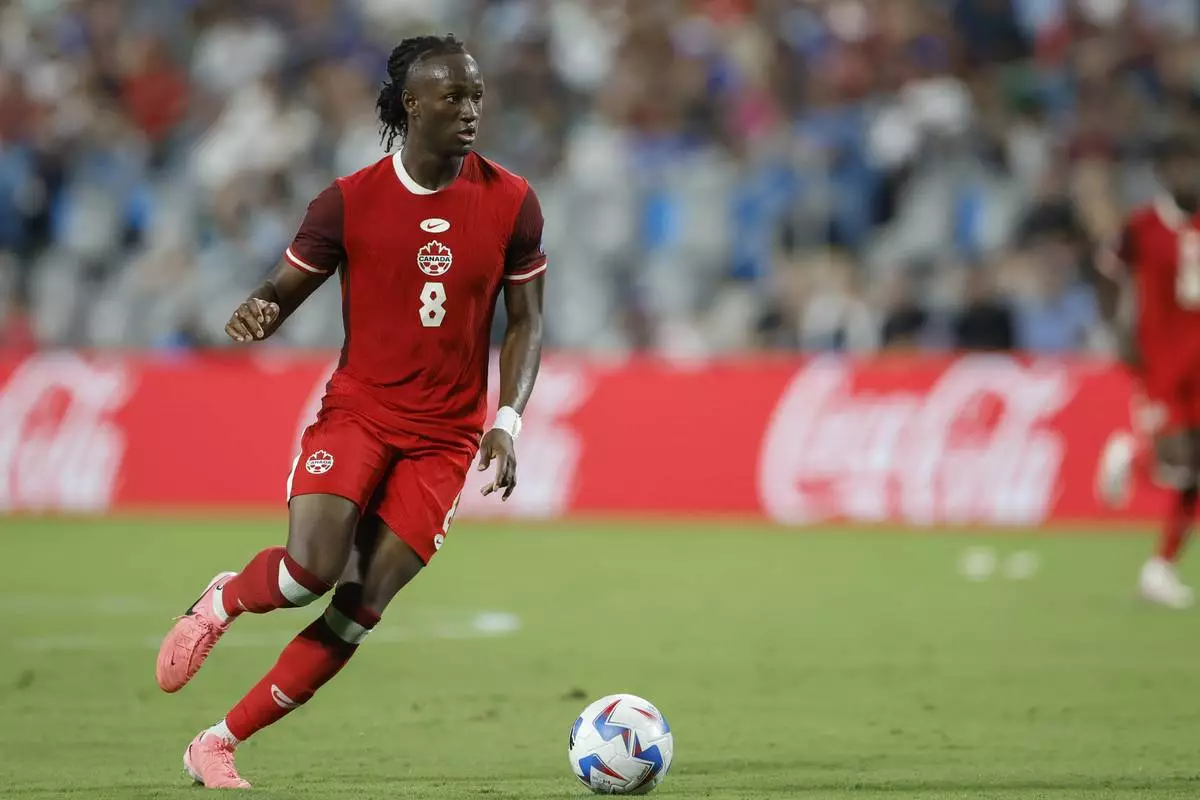 FILE - Canada midfielder Ismael Kone looks to pass during the Copa America third place soccer match against Uruguay in Charlotte, N.C., Saturday, July 13, 2024. (AP Photo/Nell Redmond, File)