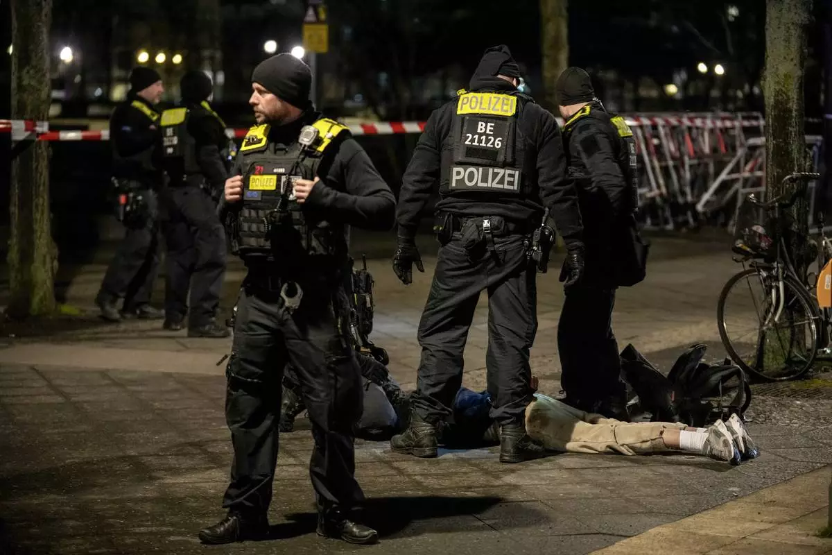 FILE - Police officers detain a man at the Holocaust memorial in Berlin, Germany, after another man was seriously injured, Feb. 21, 2025. (AP Photo/Ebrahim Noroozi, File)