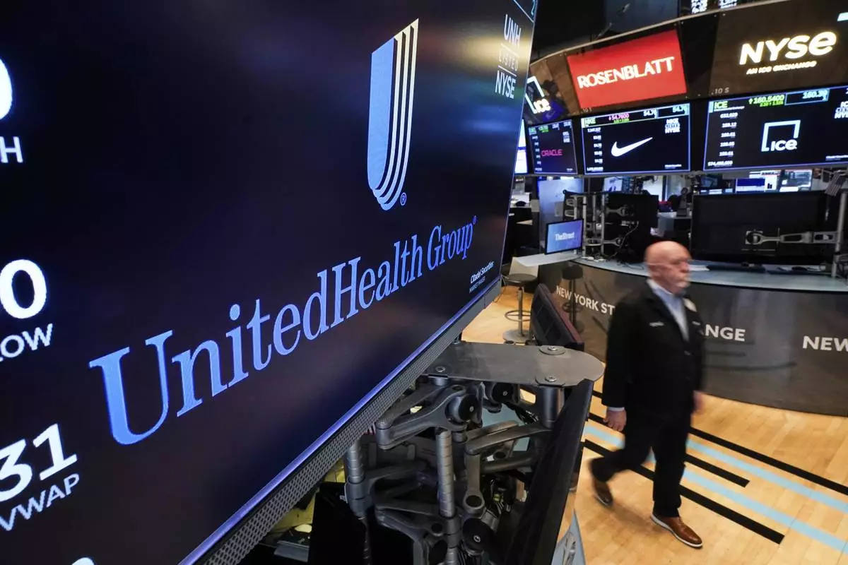 FILE - The logo for UnitedHealth Group appears above a trading post on the floor of the New York Stock Exchange, April 17, 2025. (AP Photo/Richard Drew, file)