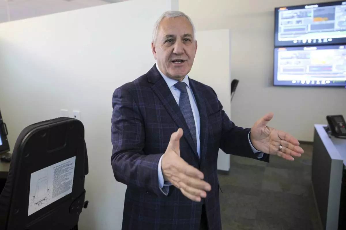 FILE - Union Pacific CEO Jim Vena talks in front of a locomotive simulator used to train engineers at the company's headquarters in Omaha, Neb., Dec. 15, 2023. (AP Photo/Josh Funk, File)