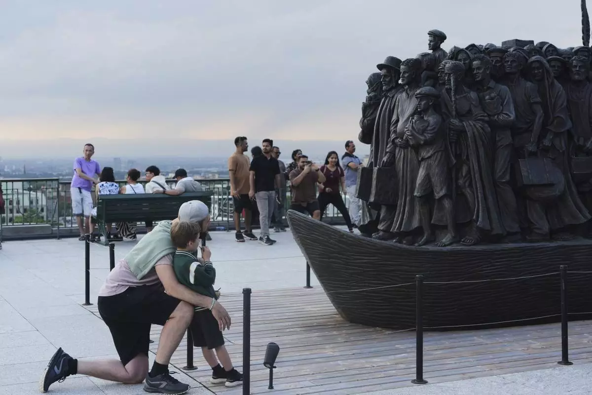 People look at a sculpture that pays tribute to migrants and refugees at the national shrine of Saint Joseph's Oratory of Mount Royal in Montreal, Saturday, June 28, 2025. (AP Photo/Luis Andres Henao)