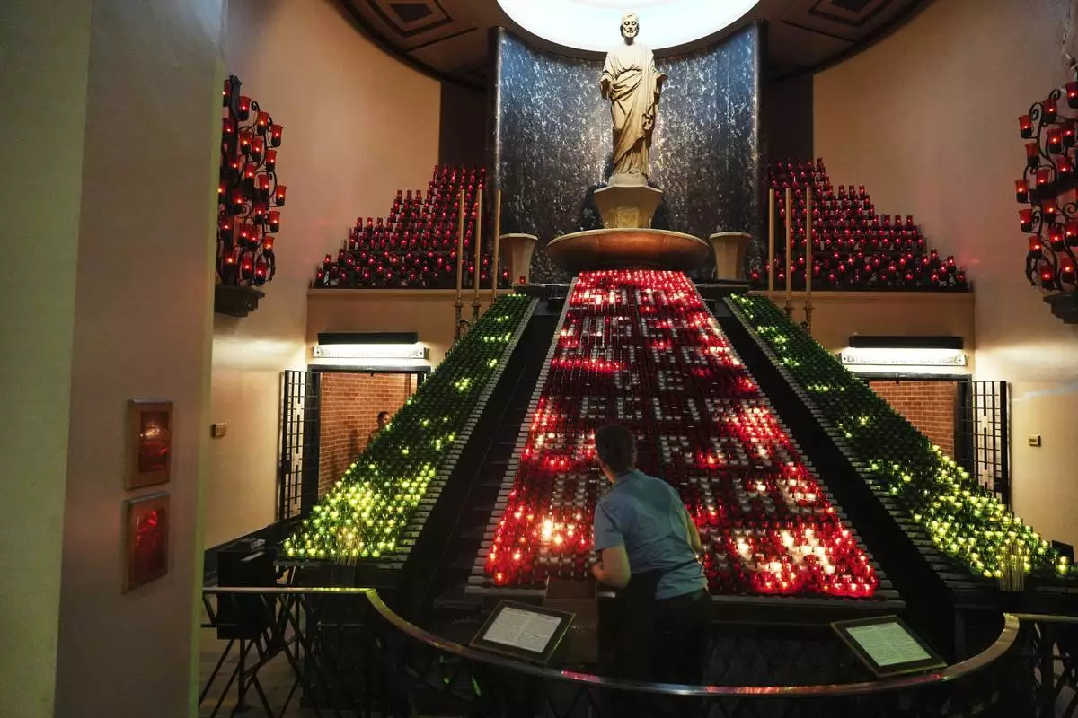 A worker arranges candles inside the Votive Chapel at the national shrine of Saint Joseph's Oratory of Mount Royal, in Montreal, Saturday, June 28, 2025. (AP Photo/Luis Andres Henao)