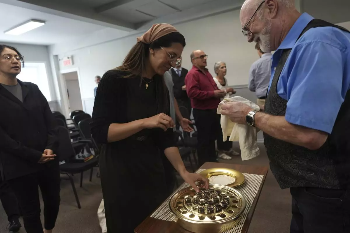 Megane Ares-Dube, center, prepares to receive communion during service at the Reformed Baptist Church in Saint Jerome, Quebec, Sunday, June 29, 2025. (AP Photo/Luis Andres Henao)