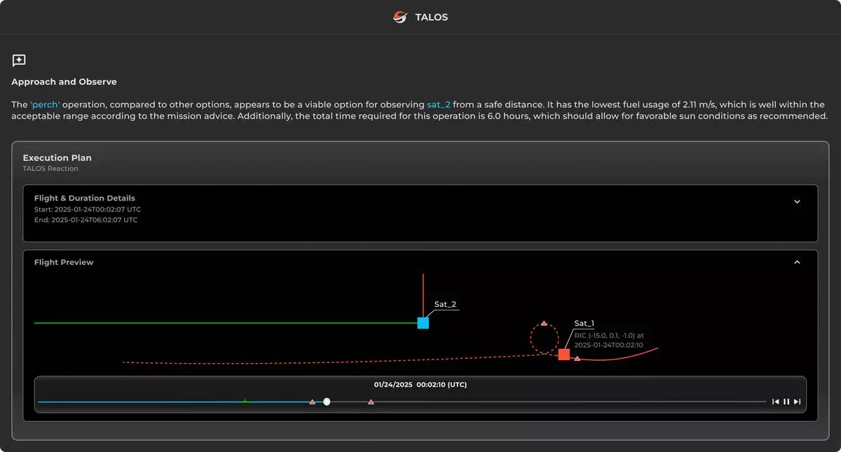 TALOS is an autonomous AI agent that simulates satellite tactics including training, maneuvering, and space combat, within a physics-accurate orbital environment. The interface, shown here, supports intuitive visualization, explainable AI interactions, and seamless usability in both training and operational contexts.