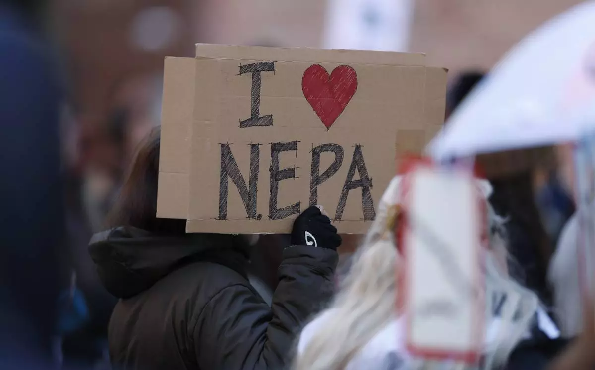 FILE - Joan Lutz, of Boulder, Colo., waves a placard at a rally of advocates to voice opposition to efforts by the Trump administration to weaken the National Environmental Policy Act, which is the country's bedrock law aimed at protecting the environment, on Feb. 11, 2020, in Denver. (AP Photo/David Zalubowski)