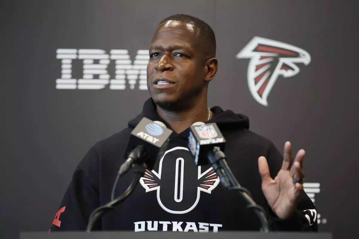 Atlanta Falcons Coach Raheem Morris speaks to the media prior to the first open training NFL football camp on Thursday, July 24, 2022, in Flowery Branch, Ga. (Miguel Martinez/Atlanta Journal-Constitution via AP)