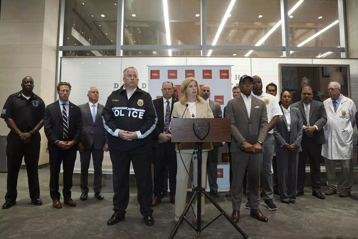 Flanked by New York Mayor Eric Adams, right, and NYPD Chief of Department John Chell, left, New York Police Commissioner Jessica Tisch speaks during a news conference at New York Presbyterian Weil Cornell Medical Center where a police officer was brought after being shot at a Manhattan office building, Monday, July 28, 2025, in New York. (AP Photo/Angelina Katsanis)