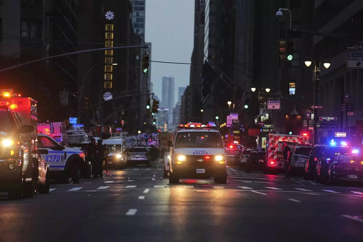 Emergency response vehicles crowd 52nd Street outside a Manhattan office building where two people were shot, including a New York police officer, Monday, July 28, 2025, in New York. (AP Photo/Angelina Katsanis)