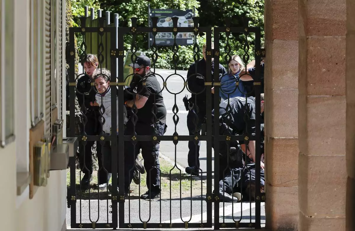 Demonstrators from Animal Rebellion are arrested by the police after entering the grounds of the Nuremberg Zoo in Nuremberg, Germany, Tuesday, July 29, 2025. (Daniel Loeb/dpa via AP)