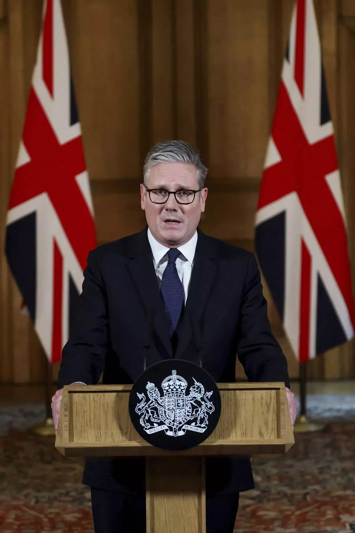 Britain's Prime Minister Keir Starmer delivers a statement inside No. 10 Downing Street on the day the cabinet was recalled to discuss the situation in Gaza, in London, Tuesday, July 29, 2025. (Toby Melville, Pool Photo via AP)