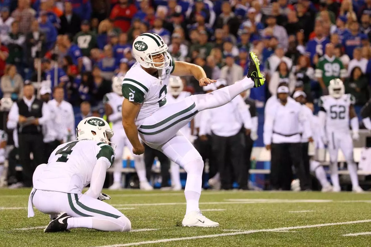 FILE - New York Jets kicker Nick Folk (2) kicks a field goal from the hold of Lac Edwards during the second half an NFL football game against the Buffalo Bills, Thursday, Sept. 15, 2016, in Orchard Park, N.Y. (AP Photo/Bill Wippert, File)