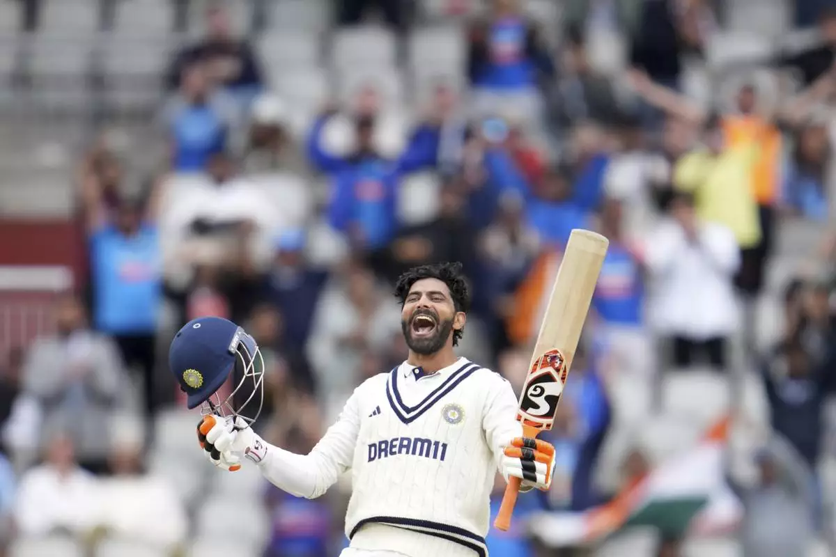 India's Ravindra Jadeja celebrates after scoring a century on the final day of the fourth cricket test match between England and India at Emirates Old Trafford, Manchester, England, July 27, 2025.(AP Photo/Jon Super)