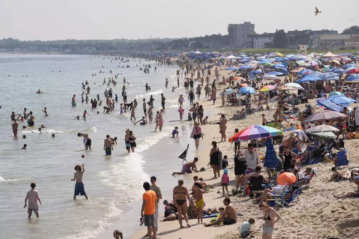 A crowd seeks relief from the heat Tuesday, July 29, 2025, at Old Orchard Beach, Maine. (AP Photo/Robert F. Bukaty)