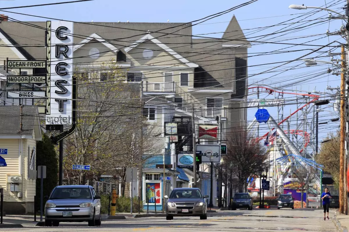 FILE - In this Thursday, May 7, 2020 photo, a main drag is quiet in Old Orchard Beach, Maine, just weeks before the summer tourist season starts. (AP Photo/Robert F. Bukaty, File)