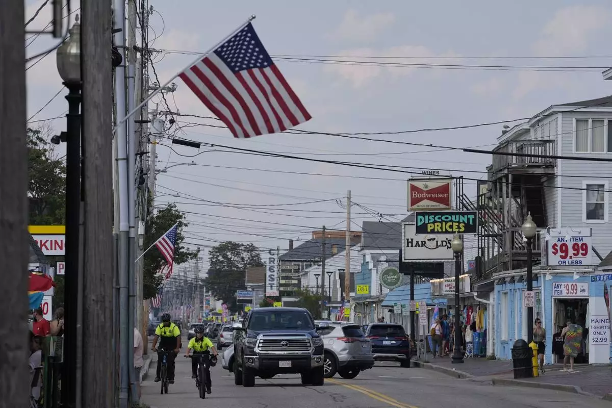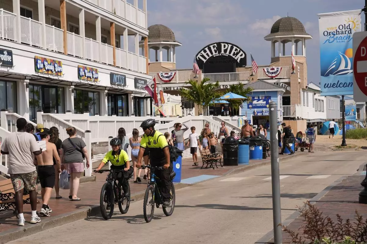 Community Service Officers from the Old Orchard Beach Police Dept. patrol on bicycles, Tuesday, July 29, 2025, in Old Orchard Beach, Maine. (AP Photo/Robert F. Bukaty)