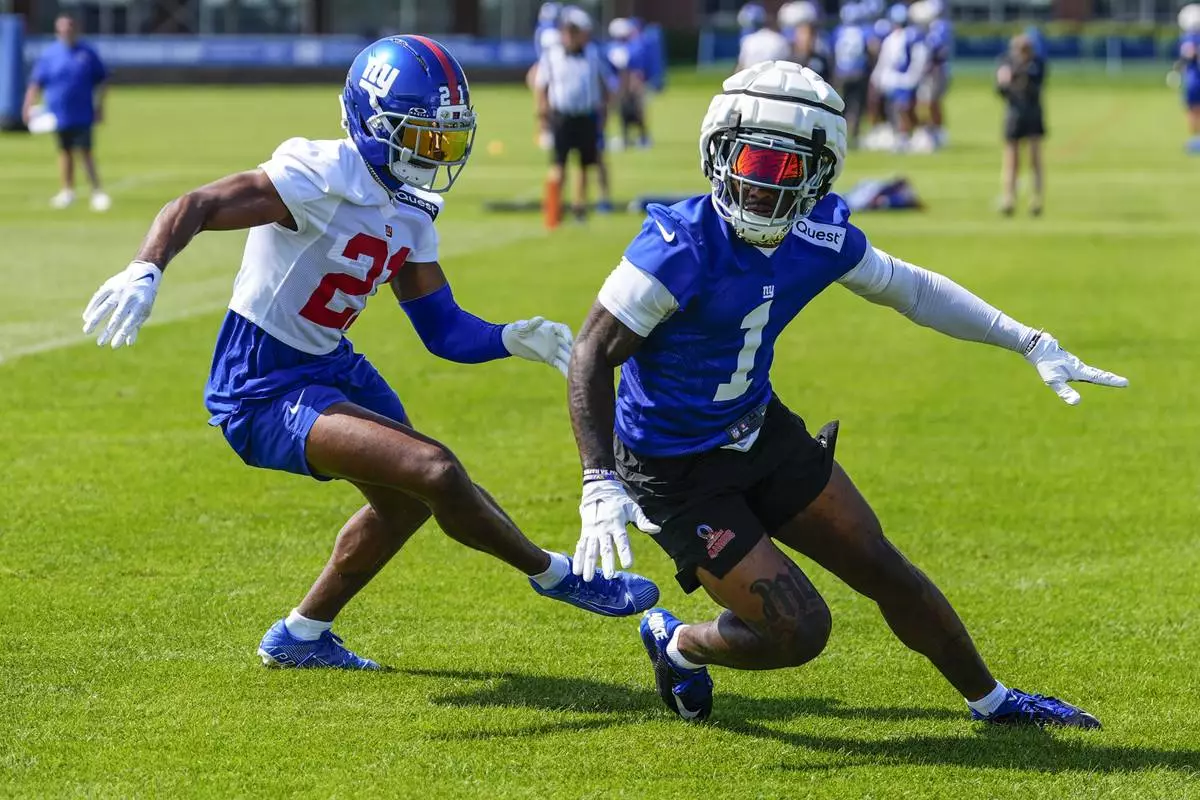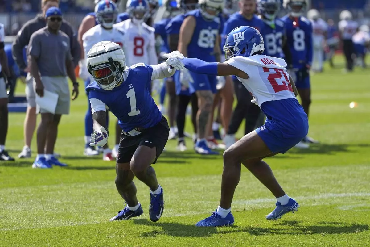 New York Giants wide receiver Malik Nabers (1) and cornerback Paulson Adebo (21) practice at the team's NFL football training camp in East Rutherford, N.J., Thursday, July 24, 2025. (AP Photo/Yuki Iwamura)