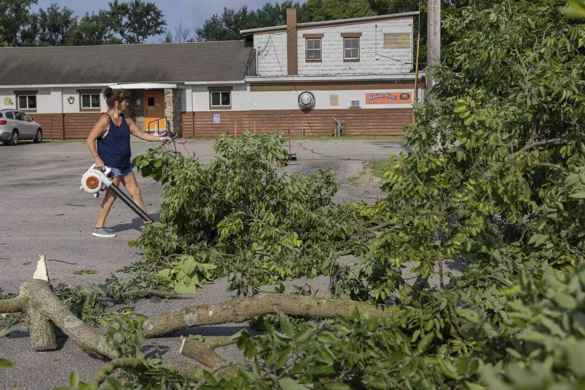 Dawn Sands cleans the parking lot at Robin's Nest Bar & Grill after a storm with extreme winds in La Crosse, Wis., Tuesday, July 29, 2025. (Saskia Hatvany/La Crosse Tribune via AP)