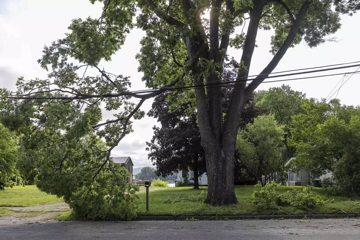 A tree limb is stuck in power lines on Bainbridge Street on French Island after a storm with extreme winds in La Crosse, Wis., Tuesday, July 29, 2025. (Saskia Hatvany/La Crosse Tribune via AP)