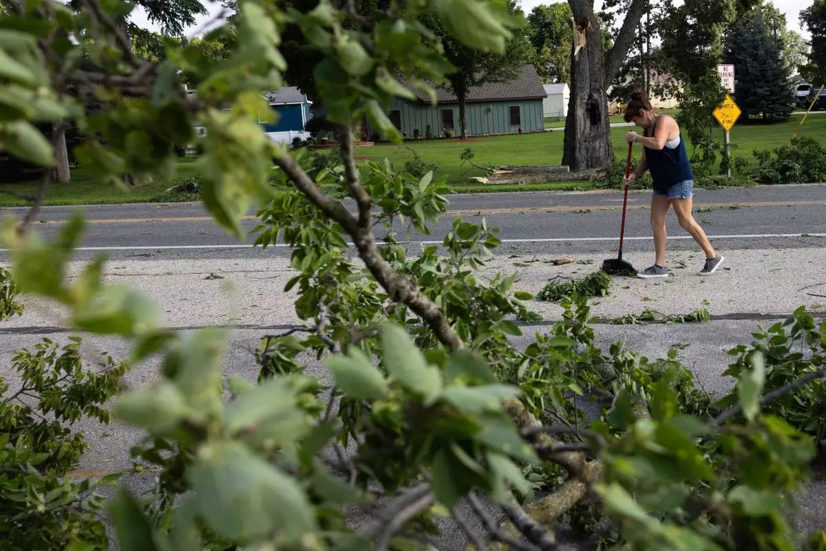 Dawn Sands cleans debris off Goddard Street on French Island after a storm with extreme winds in La Crosse, Wis., Tuesday, July 29, 2025. (Saskia Hatvany/La Crosse Tribune via AP)
