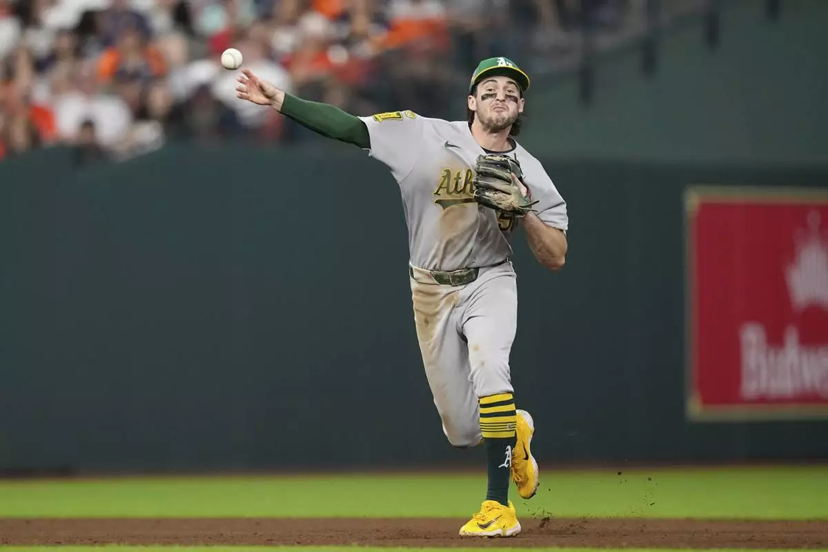 Athletics shortstop Jacob Wilson throws to first for an out after fielding a ground ball by Houston Astros' Cooper Hummel during the fifth inning of a baseball game Friday, July 25, 2025, in Houston. (AP Photo/David J. Phillip)