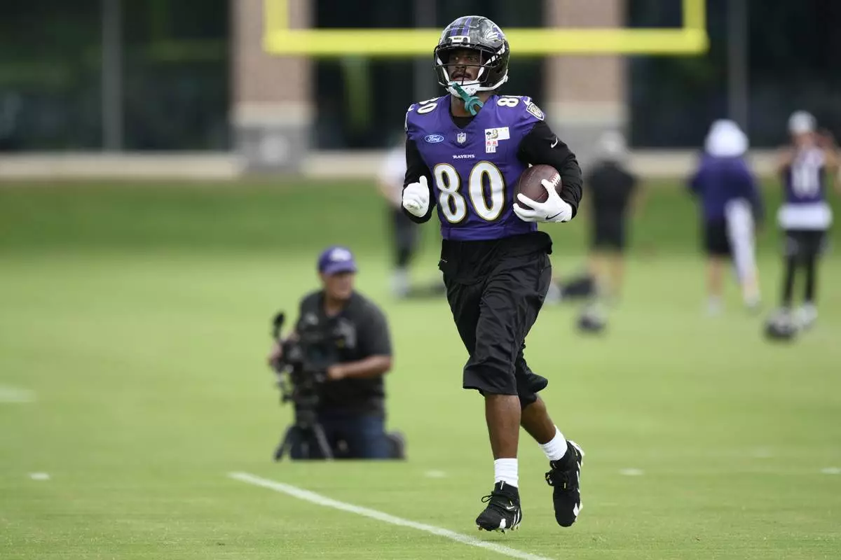 Baltimore Ravens tight end Isaiah Likely (80) works out during practice at the team's NFL football training camp, Saturday, July 26, 2025, in Owings Mills, Md. (AP Photo/Nick Wass)
