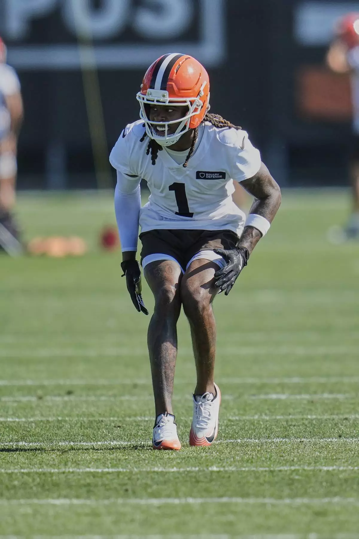 Cleveland Browns cornerback Martin Emerson Jr. (1) participates in a drill during a practice at the team's NFL football training camp Wednesday, July 23, 2025, in Berea, Ohio. (AP Photo/Sue Ogrocki)
