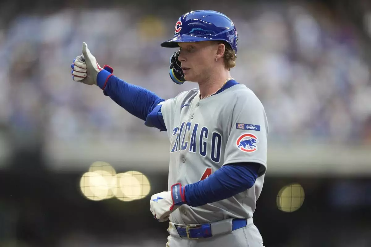 Chicago Cubs' Pete Crow-Armstrong gestures after hitting a single during the fourth inning of a baseball game against the Milwaukee Brewers, Tuesday, July 29, 2025, in Milwaukee. (AP Photo/Aaron Gash)