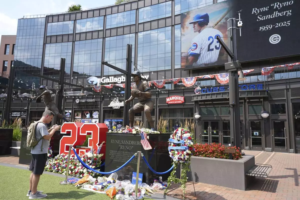 Fans visit as they leave flowers and other items at a makeshift memorial in front of the statue of Chicago Cubs' Hall of Fame second baseman Ryne Sandberg, Tuesday, July 29, 2025, outside Wrigley Field in Chicago. (AP Photo/Nam Y. Huh)