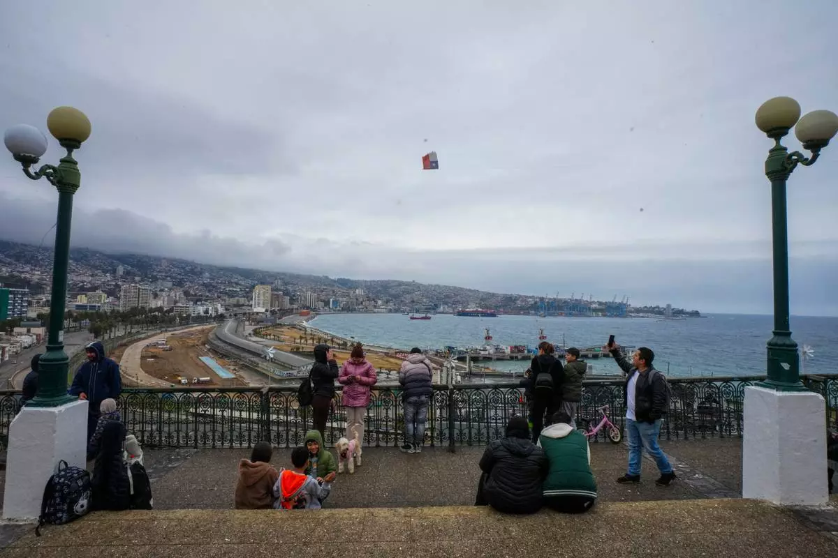 People stand at Baron viewpoint, high above the sea, to watch the water after a precautionary tsunami warning in Valparaiso, Chile, Wednesday, July 30, 2025, after an earthquake struck off the coast of Russia. (AP Photo/Esteban Felix)
