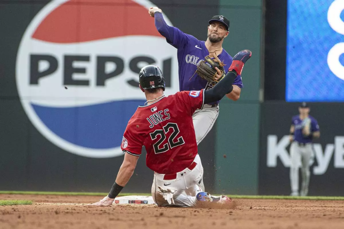 Colorado Rockies' Kyle Farmer, rear, forces Cleveland Guardians' Nolan Jones (22) out at second base and throws to first to complete a double play during the fourth inning of a baseball game, Tuesday, July 29, 2025, in Cleveland. (AP Photo/Phil Long)