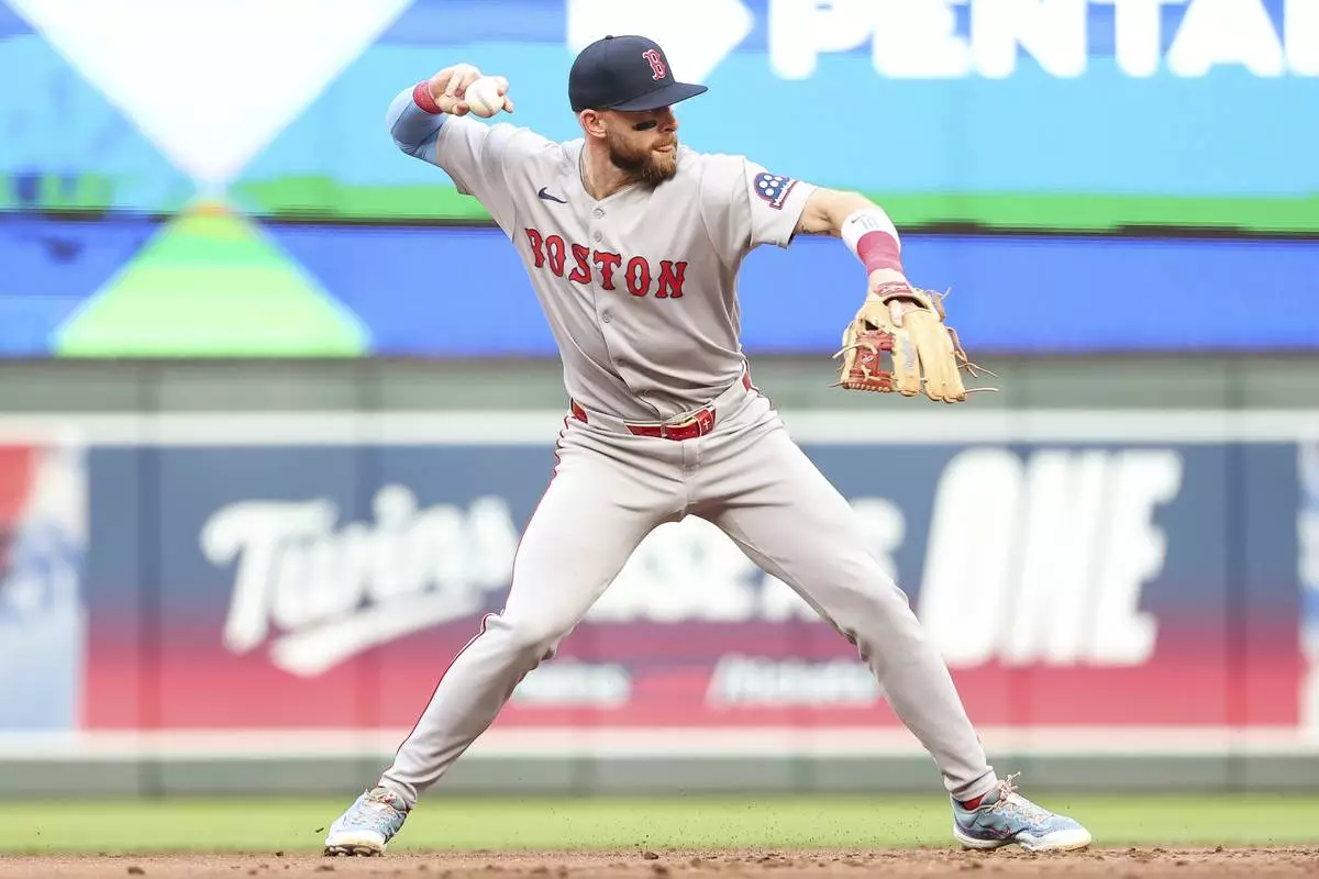 Boston Red Sox shortstop Trevor Story throws to first base to get out Minnesota Twins' Ty France during the second inning of baseball game Tuesday, July 29, 2025, in Minneapolis. (AP Photo/Matt Krohn)