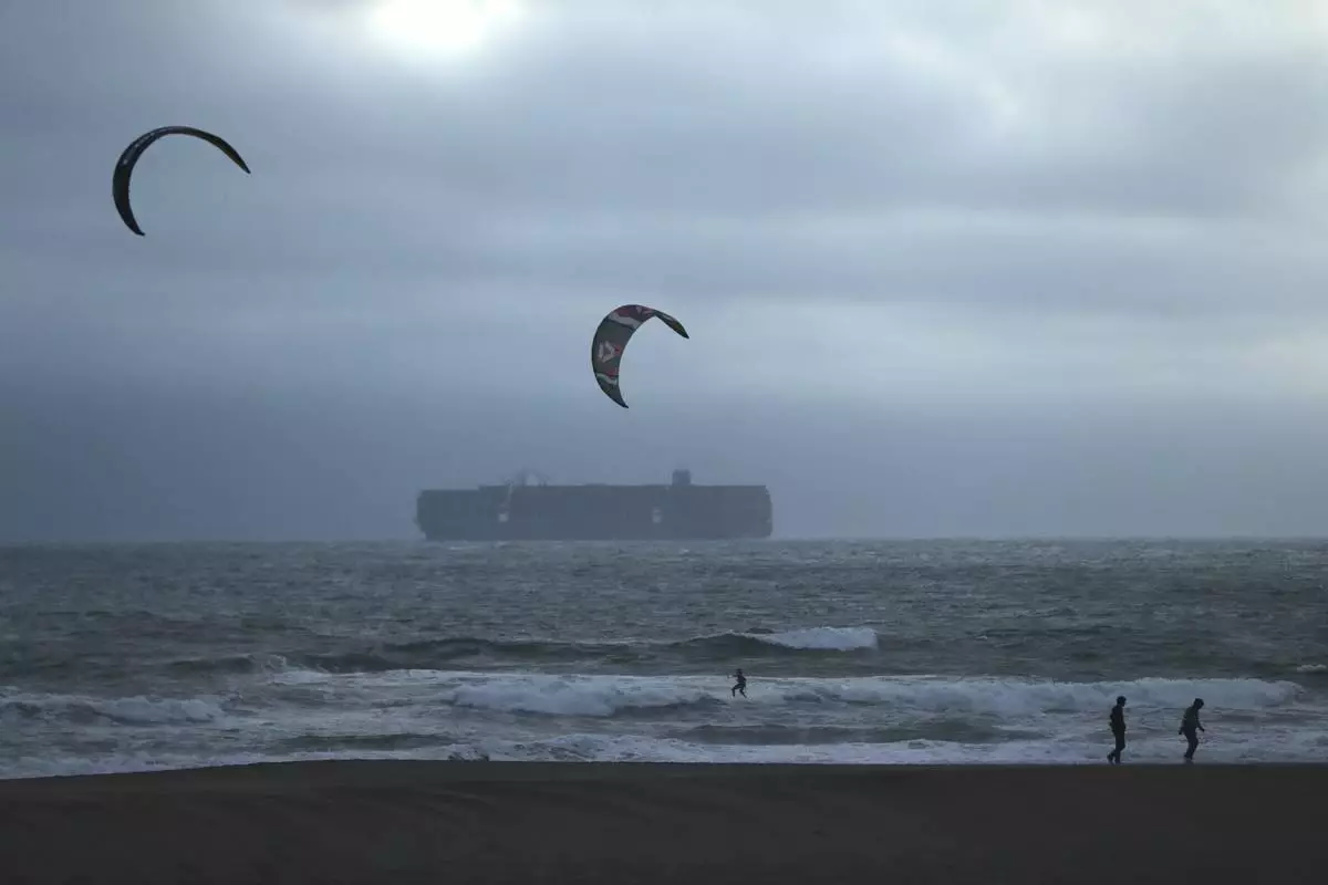 During a tsunami advisory triggered by an underwater earthquake off the coast of Russia, a pair of kite surfers recreate near two beach walkers at Ocean Beach in San Francisco on Tuesday, July 29, 2025. (Scott Strazzante/San Francisco Chronicle via AP)