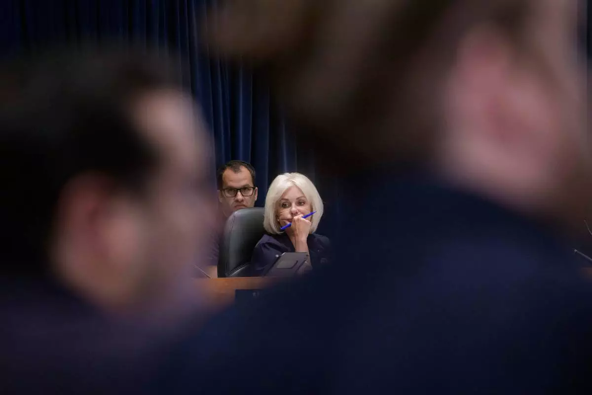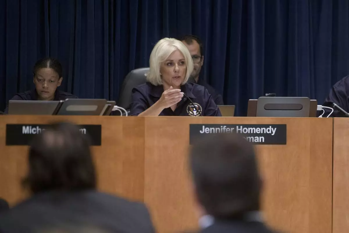 National Transportation Safety Board Chairwoman Jennifer Homendy presides over the NTSB fact-finding hearing on the DCA midair collision accident, at the National Transportation and Safety Board boardroom, Wednesday, July 30, 2025, in Washington. (AP Photo/Rod Lamkey, Jr.)